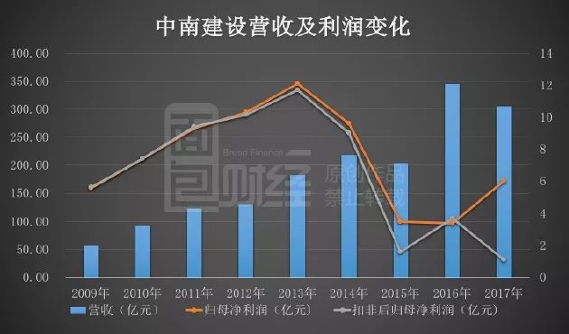 翻查財報:2017年,中南建設扣除非經常性損益后的歸母凈利潤約1.1億元,相比于上一年下滑69.96%。