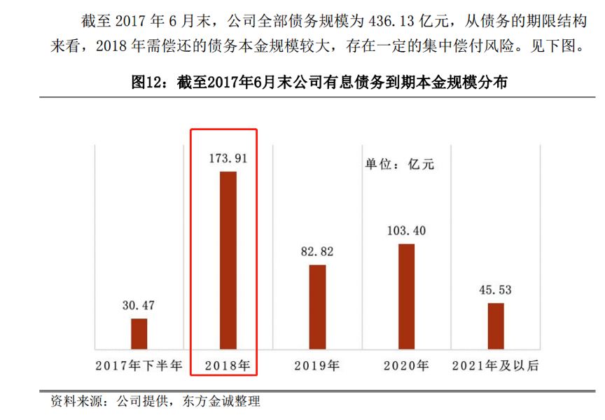 這一信息可以從中南建設公告的債券信用評級報告中獲得。由評級機構出具的公司《2017年面向合格投資者公開發行公司債券(第二期)信用評級報告》,披露的截止2017年6月末公司有息債務到期本金規模分布圖如下: