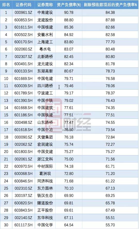 從公司所屬的證監會行業分類土木工程建筑業來看:66家上市公司,2018年一季度平均資產負債率約61.91%,中位數是63.27%;剔除預收款項后的資產負債率平均值約58.98%,中位數是59.66%。