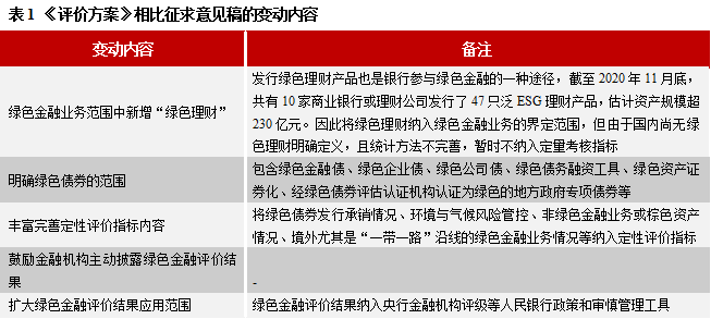 6月9日,人民銀行發(fā)布《銀行業(yè)金融機(jī)構(gòu)綠色金融評(píng)價(jià)方案》,是在2020年7月21日《關(guān)于印發(fā)〈銀行業(yè)存款類金融機(jī)構(gòu)綠色金融業(yè)績(jī)?cè)u(píng)價(jià)方案〉的通知(征求意見稿)》(以下簡(jiǎn)稱“征求意見稿”)的基礎(chǔ)上發(fā)布的正式版本。《評(píng)價(jià)方案》將于2021年7月1日起施行。評(píng)價(jià)指標(biāo)和方法上采用定量(權(quán)重80%)和定性(權(quán)重20%)結(jié)合的方法,其中定量指標(biāo)有4個(gè),定性評(píng)價(jià)指標(biāo)有3個(gè)。與征求意見稿相比,正式版《評(píng)價(jià)方案》的變動(dòng)如下表所示。