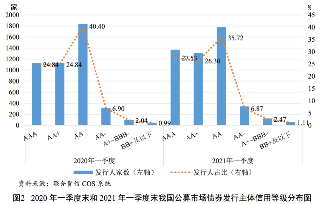 截至2021年一季度末,公募債券市場發行主體信用等級集中在AA-級及以上級別,占比(96.42%)較2020年一季度末下降0.55個百分點。其中,AA級占比仍然最高(35.72%),較2020年一季度末下降4.68個百分點;AAA級和AA+級占比為27.53%和26.30%,較2020年一季度末分別上升2.69個百分點和1.46個百分點;AA-級占比(6.87%)較2020年一季度末下降0.03個百分點。整體來看,AA+級及以上級別發行主體占比較2020年一季度末均有所上升。
