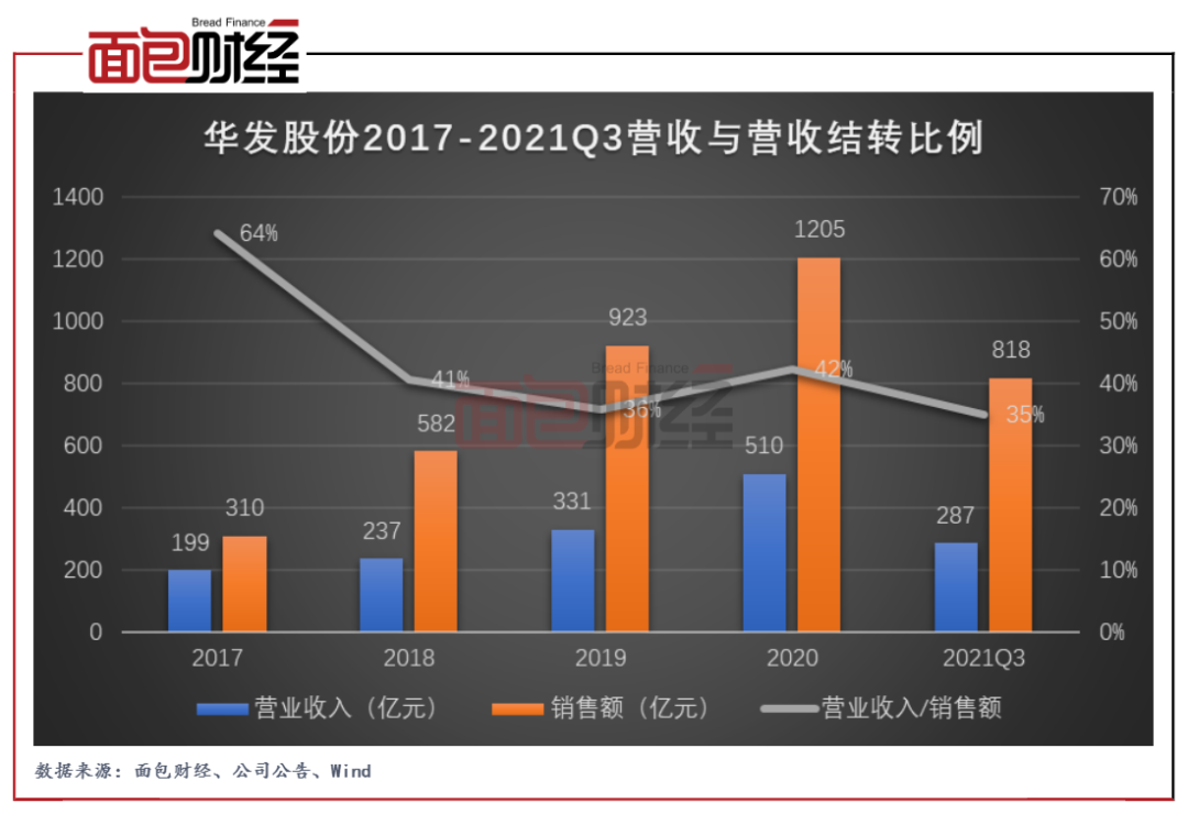不過, 其增長的銷售額卻與營收增速不匹配。2021年前三季度,華發股份實現營收286.70億元,同比下降0.32個百分點。其2021年前三季度營業收入對銷售額的結轉比例約為35%,地產行業銷售收入確認雖具有滯后性,但公司結轉比例對比往期有所下降。