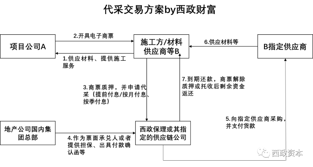 根據前文提到的邏輯,如果開發商的交易對手(比如總包方、材料供應商等)本身能解決融資的問題,那開發商就不需要太依賴自身的融資去解決材料和工程款的應付問題(比如直接開商票進行支付即可)由此就可以大量減少有息負債的需求,而且總包方、材料供應商的融資成本較低的情況下一定程度上還可以總體拉低房企的融資成本(假設總包方、材料供應商是房企可控制的主體)。以下以我們目前開展較多的代采業務為例簡單舉例說明。