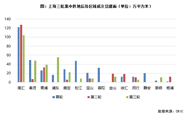 從各區域成交含宅地塊的情況來看,三輪集中供地后,浦東南匯和奉賢成為年內“供地大戶”,成交建面超過100萬平方米,尤其南匯成交總建面高達353萬平方米,占總成交建面的37%。此外,成交建面最高的三個區域占總成交建面的58%,也就是未來上海接近六成的住宅項目將集中于這三個區域。
