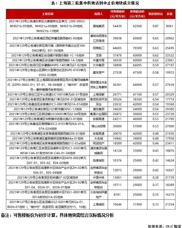 僅有尤其港城集團競得的浦東花木板塊地塊,雖然名義樓板價僅有13489元/平方米,但是剔除大比例科研用地后,實際可售住宅的樓板價達到54439元/平方米,地價房價比高達0.87,且每平方米價差僅有8061元,盈利的難度非常大,因此在地塊地理條件不錯的情況下,也僅有政府平臺底價拿地。