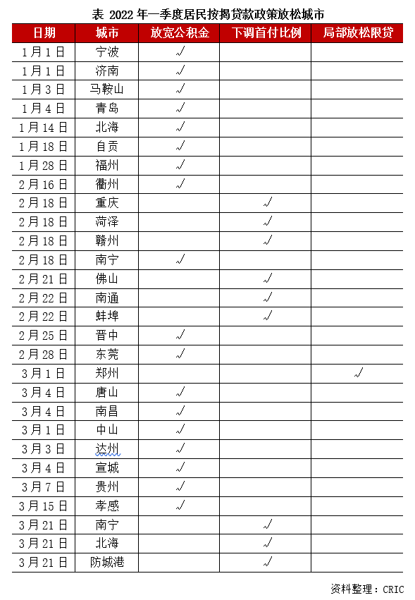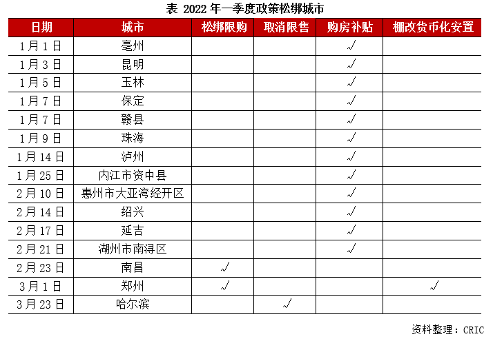 2022年一季度,中央多部委密集表態(tài)穩(wěn)地產(chǎn),財政部明確今年內(nèi)不具備擴大房地產(chǎn)稅改革試點城市的條件,兩會定調探索行業(yè)新發(fā)展模式,支持新市民等三類購房需求。房企融資、預售資金監(jiān)管適度松綁,并購貸不計入“三道紅線”、保障性租賃住房貸款不計入“兩道紅線”、全國性商品房預售資金監(jiān)督管理辦法出臺。居民按揭貸款政策邊際改善,各地放寬公積金貸款、下調首付比例、局部放松限貸、下調房貸利率。15城出臺新政刺激購房需求,重點涉及松綁限購、取消限售、發(fā)布購房補貼、棚改貨幣化安置等。