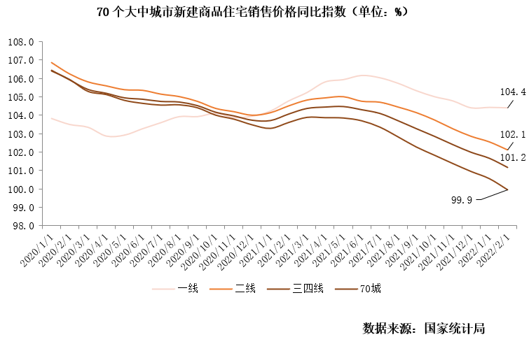 1-2月商品房銷售均價為9845元/平方米,環(huán)比上升3%,同比下降11%。2月70個大中城市新建商品住宅銷售價格同比上升1.2%,其中三四線城市同比下降0.1%。