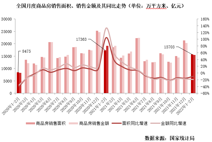 據(jù)國家統(tǒng)計局數(shù)據(jù):1—2月,商品房銷售面積15703萬平方米,同比下降9.6%;商品房銷售額15459億元,下降19.3%。