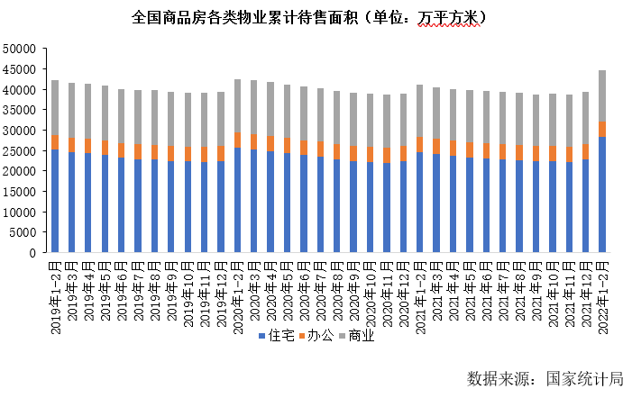國家統(tǒng)計局公布數(shù)據(jù)顯示,2月末,商品房待售面積57026萬平方米,比2021年末增加6003萬平方米。其中,住宅待售面積增加5552萬平方米,辦公樓待售面積增加104萬平方米,商業(yè)營業(yè)用房待售面積減少335萬平方米。