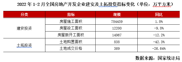 2022年一季度行業(yè)繼續(xù)調整,前2月銷售和投資同比增速均為近6年次低,全國商品房銷售面積、金額分別同比下降10%和19%,銷售均價同比下降11%。土地購置面積和房屋新開工、竣工面積分別同比下降42%、12%和10%,僅房屋施工面積微增2%,受此影響下開發(fā)投資額僅同比微增4%。