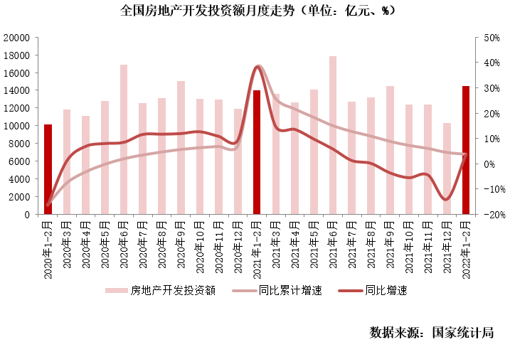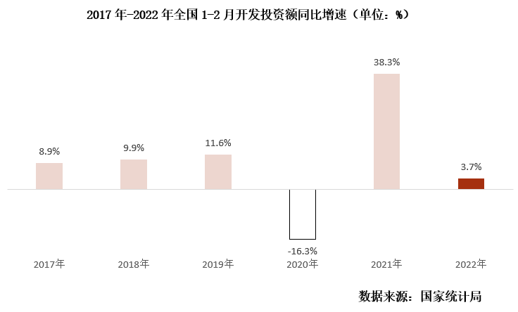 據(jù)國家統(tǒng)計局數(shù)據(jù):1—2月,全國房地產(chǎn)開發(fā)投資14499億元,同比增長3.7%。對比往年同期來看為近6年次低,僅高于2020年。