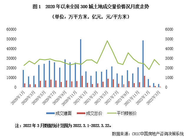 成交規(guī)模跌入谷底,同比降幅高達六成。一季度,全國300城經(jīng)營性土地成交建筑面積僅15771萬平方米,環(huán)比跌幅高達81%,同比來看,受集中供地階段性“低谷”和市場下行的影響,同比降幅高達60%。分月來看,在供地節(jié)奏變化及多地疫情反彈的影響下,1-3月的土地成交量均明顯不及去年同期,一季度土地成交規(guī)模也因此跌入谷底。