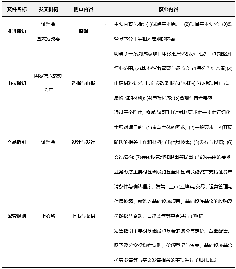 結(jié)合此前已經(jīng)頒布的包括《關(guān)于推進(jìn)基礎(chǔ)設(shè)施領(lǐng)域不動(dòng)產(chǎn)投資信托基金(REITs)試點(diǎn)相關(guān)工作的通知》(“40號(hào)通知”或“推進(jìn)通知”)、《關(guān)于做好基礎(chǔ)設(shè)施領(lǐng)域不動(dòng)產(chǎn)投資信托基金(REITs)試點(diǎn)項(xiàng)目申報(bào)工作的通知》(“586號(hào)文”或“申報(bào)通知”)、《公開募集基礎(chǔ)設(shè)施證券投資基金指引(試行)》(“54號(hào)公告”或“產(chǎn)品指引”), 我們認(rèn)為, 配套規(guī)則和上述規(guī)范性文件, 具有清晰的層次和明確的分工, 分別從原則、選擇與申報(bào)、設(shè)計(jì)與發(fā)行、上市與交易的角度, 共同完善并構(gòu)成了公募REITs業(yè)務(wù)的規(guī)則體系。