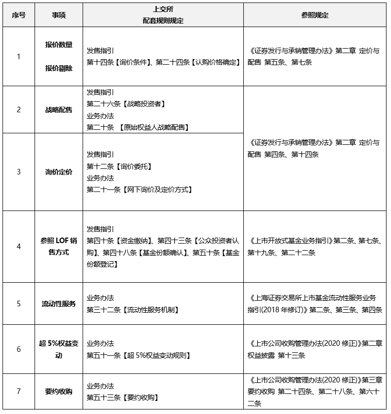 從思路來(lái)看, 配套規(guī)則總體采取了“比照股性規(guī)則, 搭建獨(dú)立體系”的總體立法思路。在業(yè)務(wù)辦法中, 比照了公開發(fā)行證券要求建立掛牌和上市審查制度, 但在全流程重要節(jié)點(diǎn)和關(guān)鍵環(huán)節(jié)規(guī)范與權(quán)責(zé)分配的角度, 保留了REITs產(chǎn)品的特殊性特色。在發(fā)售指引中, 借鑒了股票定價(jià)和LOF基金發(fā)售, 對(duì)公募REITs的詢價(jià)和定價(jià)進(jìn)行了規(guī)范, 但同時(shí)在投資者報(bào)價(jià)個(gè)數(shù)要求、報(bào)價(jià)剔除、戰(zhàn)略配售機(jī)制等方面充分結(jié)合產(chǎn)品屬性特征, 作出了區(qū)別股票的特有安排。