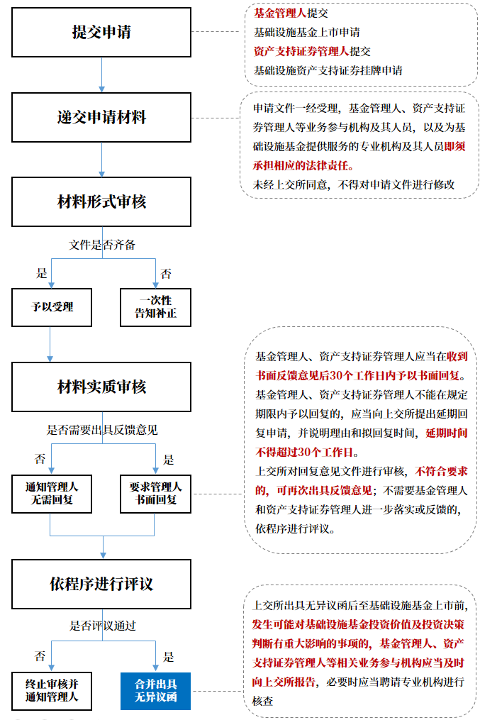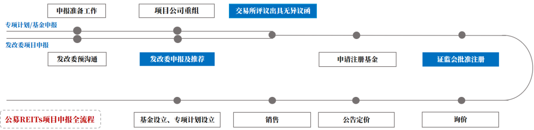 其一, 公募RETIs作為公募基金和資產(chǎn)支持證券相結(jié)合的產(chǎn)品, 上交所借鑒了此前對(duì)資產(chǎn)支持證券的管理經(jīng)驗(yàn), 結(jié)合公開證券發(fā)行的要求, 細(xì)化了對(duì)基礎(chǔ)設(shè)施資產(chǎn)支持證券的掛牌及基金上市的申請(qǐng)條件、協(xié)同盡調(diào)、申請(qǐng)文件等方面的要求, 同時(shí)明確了材料受理、審核與反饋所需時(shí)間。我們對(duì)公募REITs的申報(bào)全流程及上交所基本審核程序的梳理如下圖所示:
