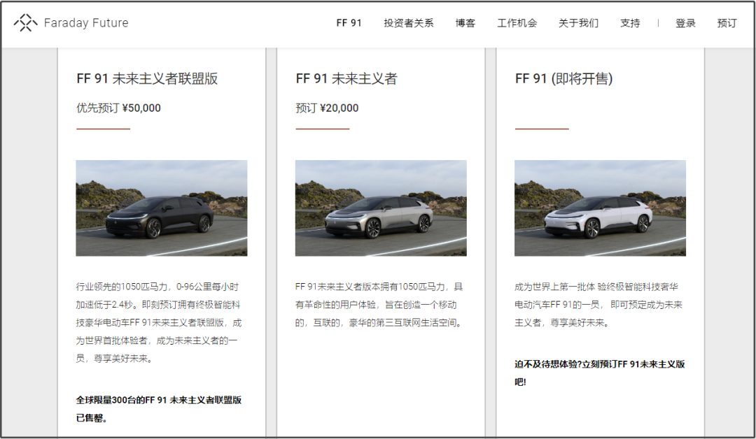7月28日,賈躍亭在微博中表示,“洛杉磯7月24日早6:30,面向全球極少數塔尖用戶開放的300臺邀約制限量版FF 91 Futurist Alliance Edition售罄”。