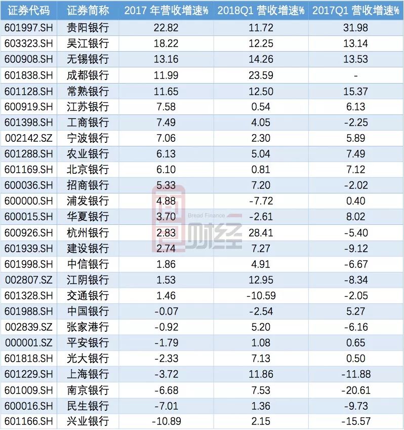 盡管市場趨于悲觀,但實際上2018年一季度,一些大中型銀行經營情況是有改善的,一個明顯的信號就是營收普遍恢復增長。