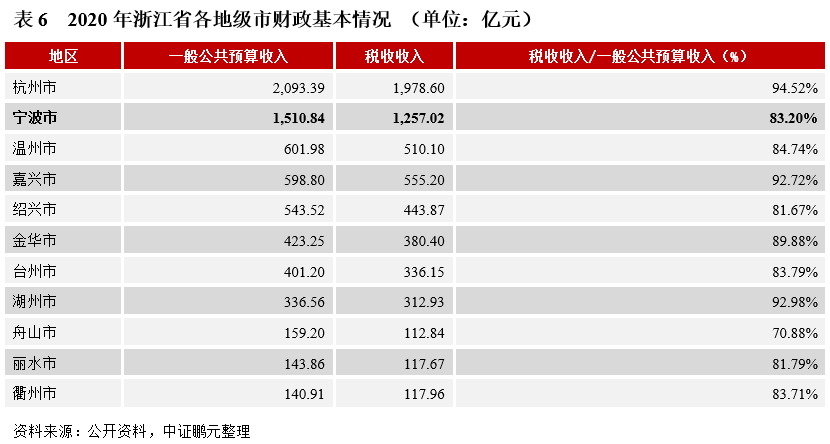 (1)財政收入:近年來,寧波財政收入穩健增長,綜合財政實力在省內僅次于杭州市,且保持了較好的財政收入質量。2020年,寧波的公共財政收入為1,510.84億元,較上年增長2.9%,其中稅收收入1,257.02億元,占公共財政收入的比重為83.2%,雖與杭州、湖州、嘉興、金華等市相比有一定差距,但稅收收入占比總體較高,顯示寧波具備較強的經濟增長活力與競爭力(見表6)。