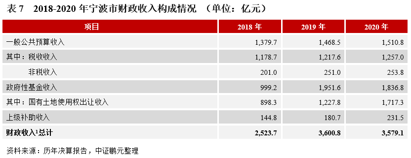 (3)財政實力:近年來,寧波市財政收入穩健增長,綜合財政實力在省內僅次于杭州市。2020年,寧波出臺一系列助力復工復產政策以對沖疫情影響,其民營外向型經濟實現較快復蘇,帶動稅收收入取得同比正增長,且稅收收入占比保持較高水平;2020年寧波樓市調控先揚后抑,但同時繼續放寬落戶條件,居民購房熱情高漲,全年商品房住宅量價齊升,土地出讓金同比大幅增長,較好緩解了疫情對政府性基金收入的拖累。