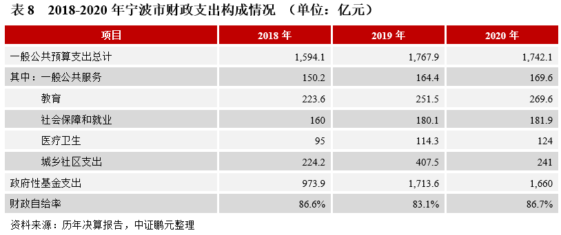 (2)財政支出:近三年寧波市一般公共預算支出規模變動不大,主要支出偏向教育、社保、醫療和城鄉社區等剛性支出。2020年,寧波市一般公共預算支出共計1,742.1億元,支出結構與以往年度基本一致;2020年政府性基金支出較上年變化不大,以國有土地使用權出讓相關支出為主。此外,寧波財政自給程度很高,2020年財政自給率較上年提升3.6個百分點至86.7%(見表8)。