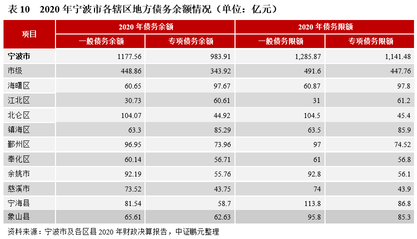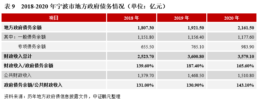 (4)政府債務:截至2020年末,寧波市地方政府債務余額2,161.50億元。從償債能力和債務壓力來看,寧波市財政收入對地方政府債務余額的覆蓋程度較好,近三年的覆蓋比率均超過130%;地方政府債務余額/公共財政收入的比率處于適當水平,近三年的平均比率為134.94%,債務壓力一般。從融資空間來看,除寧波市級、寧海縣、象山縣外,市六區和兩個縣級市的政府債務余額均已逼近限額,高度依賴新增債務額度。