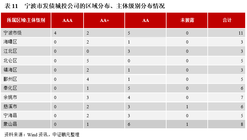 截至2021年10月末,寧波共有62家發債城投公司(以本文甄選標準作為依據)。從主體信用級別來看,AAA級共4家,AA+級共24家,AA級共32家,還有2家未披露其主體級別。從所屬區域來看,寧波市級共11家,象山縣8家,余姚市7家,奉化區和慈溪市各有6家,鄞州區、北侖區和寧海縣各有5家,海曙區、江北區和鎮海區各有3家(見表11)。受制于區域經濟財政實力水平和資源協調能力,寧波的區縣級城投公司中沒有AAA級高等級主體,但卻不乏AA+級和AA級主體,區縣級城投公司數量在全部AA+級主體和全部AA級主體中的占比分別達到91.67%和84.38%。