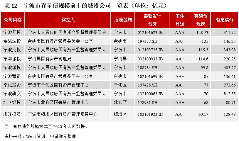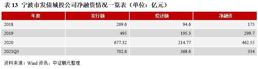 (5)城投公司:截至2021年10月末,寧波共有62家發債城投公司。AAA級主體共4家,AA+級共24家,AA級共32家;發債總體上較為活躍,目前存量債規模在50億元以上的有15家,存量債規模在10億元及以上的有37家;近幾年寧波市城投公司的新發債券規模均高于到期償債規模,凈融資呈擴大態勢。下一階段,寧波的區域經濟財政實力有望進一步提升,其在債券市場上的活躍度還會繼續提升。