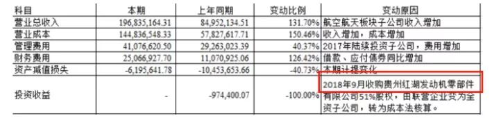 在公司2018年一季報中,公司在解釋投資收益變動原因時提到:“2018年9月收購貴州紅湖發(fā)動機(jī)有限公司51%股權(quán),由聯(lián)營企業(yè)變?yōu)槿Y子公司,轉(zhuǎn)為成本法核算”,以下為財報截圖: