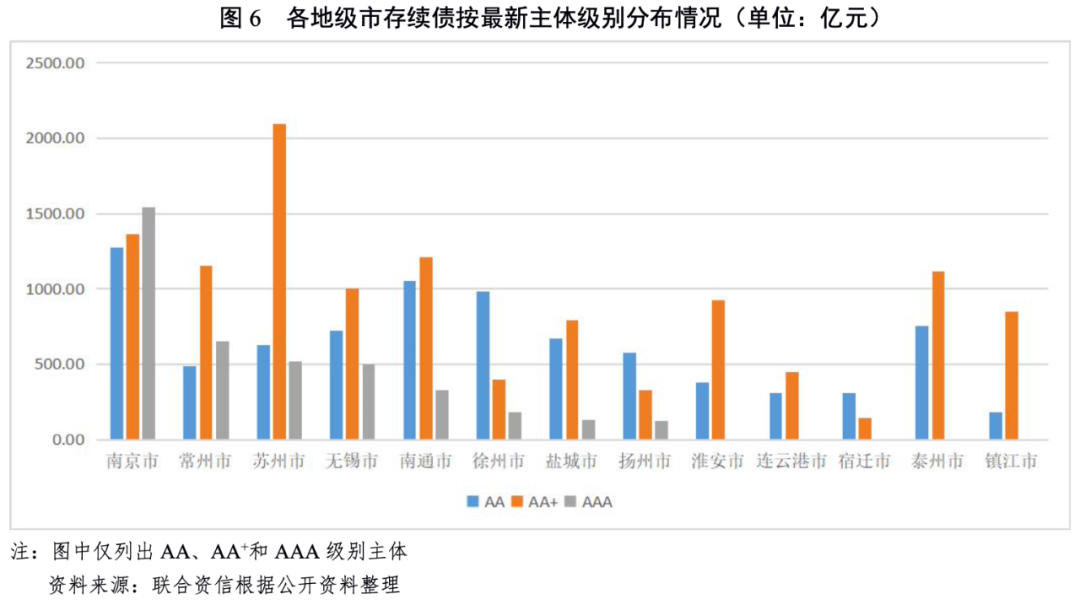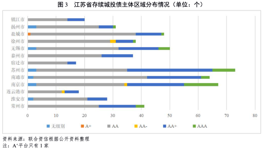 江蘇省作為國內城投債存量規模最大的省份,發債城投企業數量最多,蘇南與蘇北地區發債城投企業主體信用水平分化較為明顯。