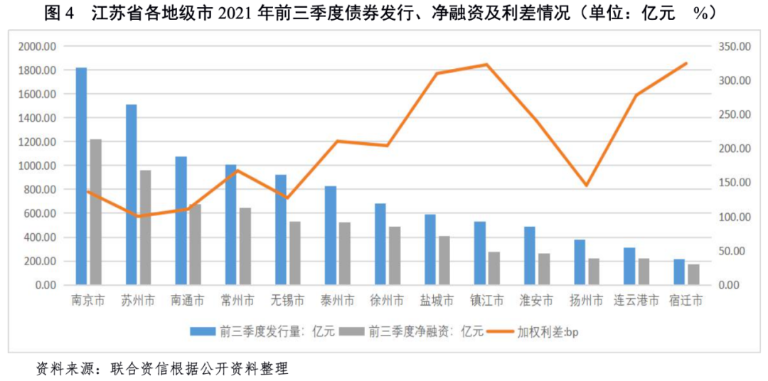 江蘇省城投債發行及存續規模大,主要集中于蘇南地區,南京市新發及存續規模最大,宿遷市最?。淮胬m債券信用等級整體以高等級為主,蘇南地區存續城投債信用等級整體高于蘇中及蘇北地區,徐州、揚州及宿遷市存續債以AA級為主;存續債券行政層級以較低的區縣及園區級為主,蘇南地區存續城投債行政層級下沉程度整體大于蘇中及蘇北地區。蘇南地區城投債發行成本優勢明顯好于蘇北地區,宿遷市、鎮江市和鹽城市發債成本省內相對較高。2021年前三季度,江蘇省各地市債券凈融資規模均為正,宿遷市、連云港市和揚州市債券凈流入規模偏低。