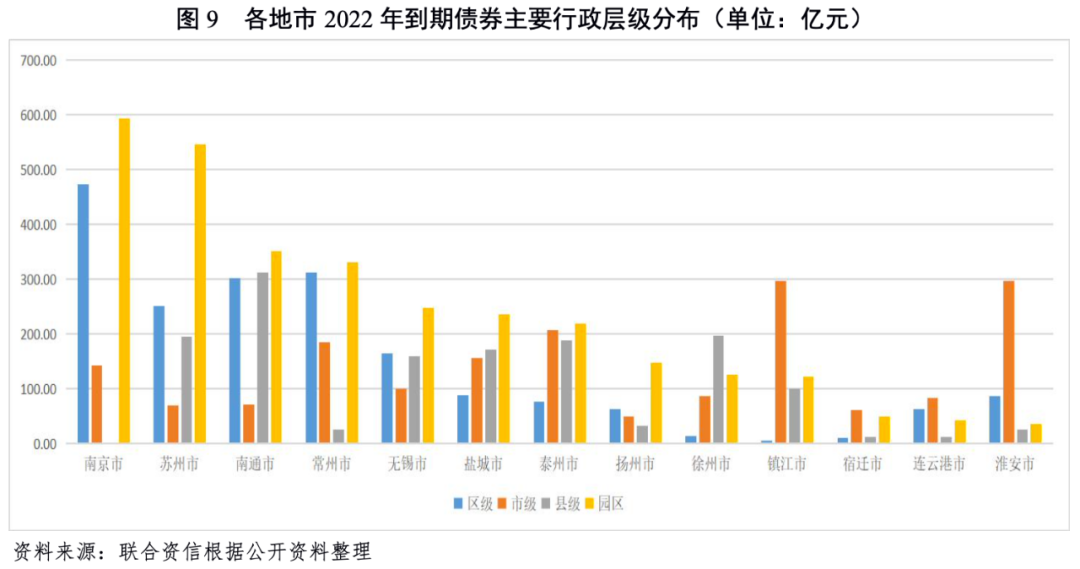 江蘇省未來三年內債券到期分布較均勻,2022年到期債券城投企業以區縣及園區級為主,主體級別以高等級為主;其中南京市、南通市及蘇州市債券到期規模較大,鎮江、宿遷、連云港及淮安市到期城投債券行政層級以市級為主,宿遷市、徐州市和揚州市低級別城投企業存續債到期規模占其債券總額比重較高。