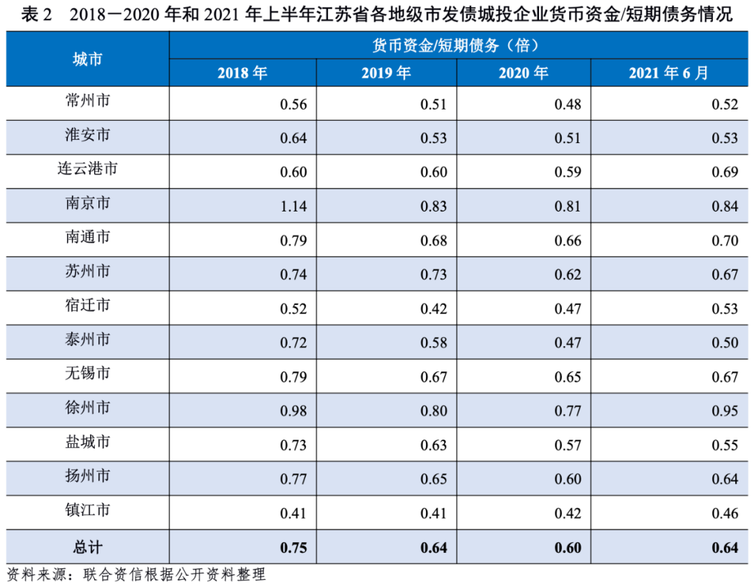 2020年,江蘇省發債城投企業債務負擔有所加重,常州市、南京市、泰州市城投企業債務負擔較重;短期償債能力指標有所弱化,鎮江市城投企業短期償債能力相對較弱,常州市和泰州市區縣級城投企業短期償債壓力較大。江蘇省城投企業整體融資環境良好,城投企業凈融資持續增長,2020年增速同比下滑,淮安市城投企業凈融資同比降幅較大;2021年上半年,江蘇省城投企業債券凈融資情況整體較好,宿遷市和鎮江市凈融資額偏低,進度偏慢。