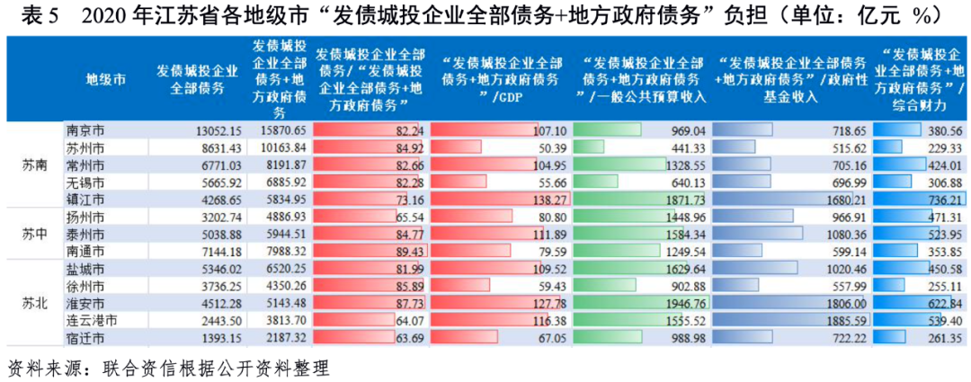從“發債城投企業全部債務+地方政府債務”規???,蘇南地區整體高于蘇中和蘇北地區各地級市。截至2020年底,南京市“發債城投企業全部債務+地方政府債務”規模最大,蘇州市位列其后,規模第3~5位由高至低依次為南通市、常州市和無錫市,宿遷市“發債城投企業全部債務+地方政府債務”規模最小,為2187.32億元。