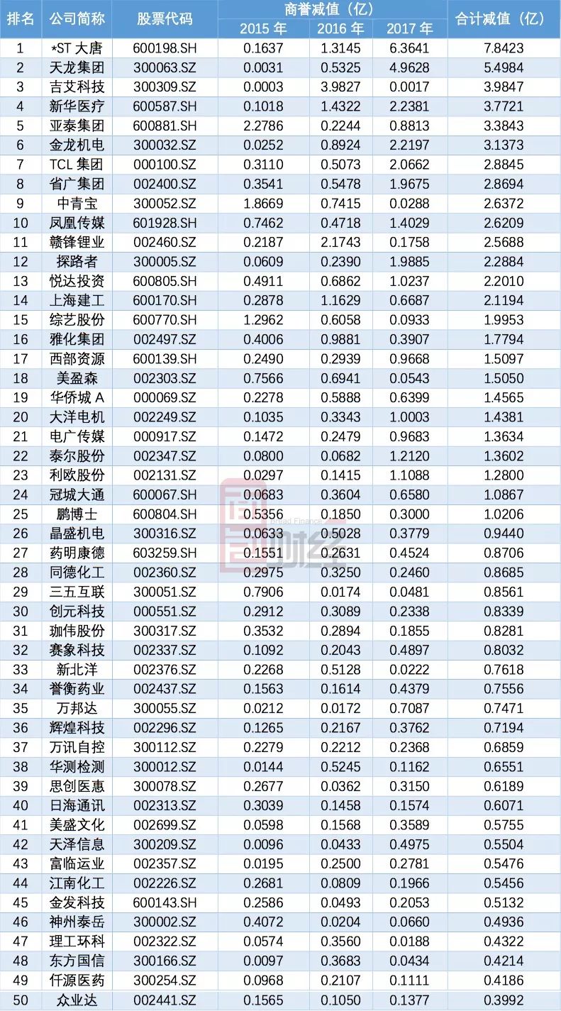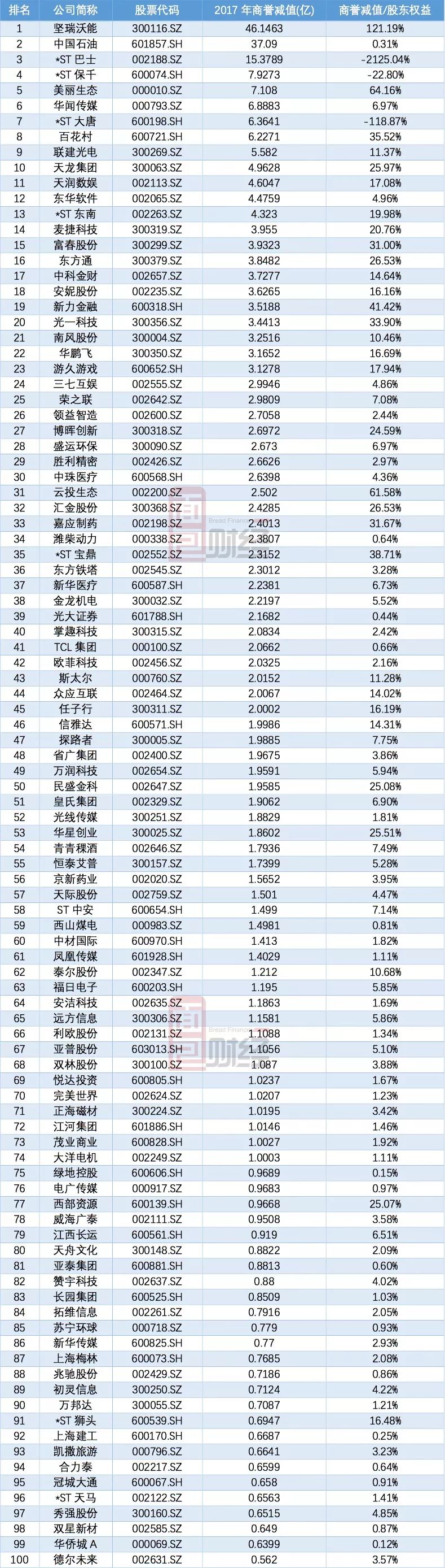 以下是2017年商譽減值金額排名前100的公司名單: