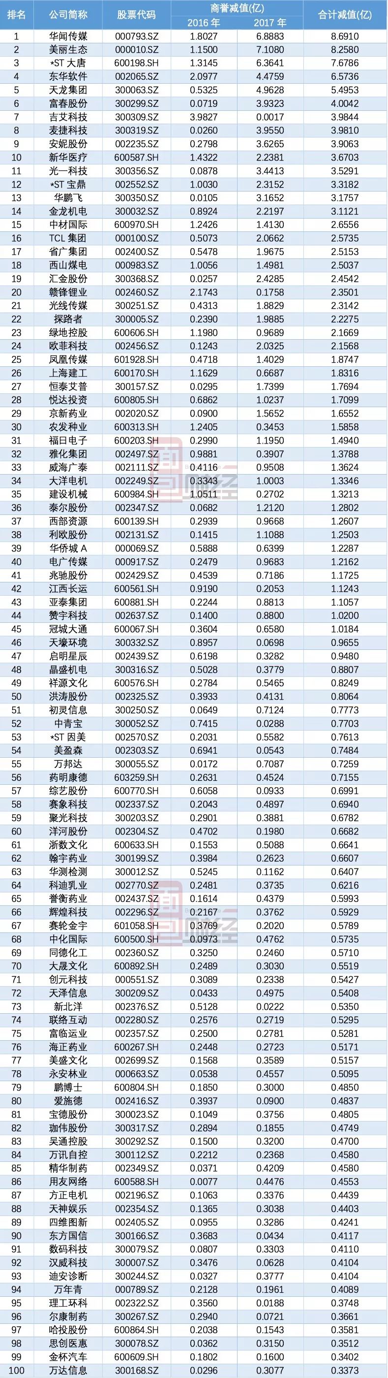 其中,有176家公司2016和2017年連續兩年出現商譽減值。兩年合計減值金額排名前100的公司如下: