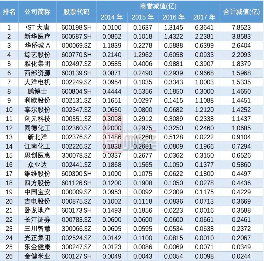 更有26家公司2014至2017年,連續四年商譽減值,名單如下: