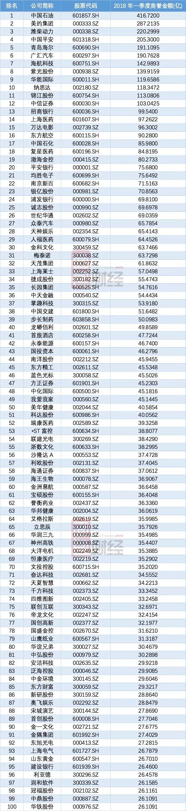 截止2018年一季度末,A股有1945家公司賬面上有商譽,總額13,403.77億元,較上年增加2042億元。商譽總額前100名排名如下: