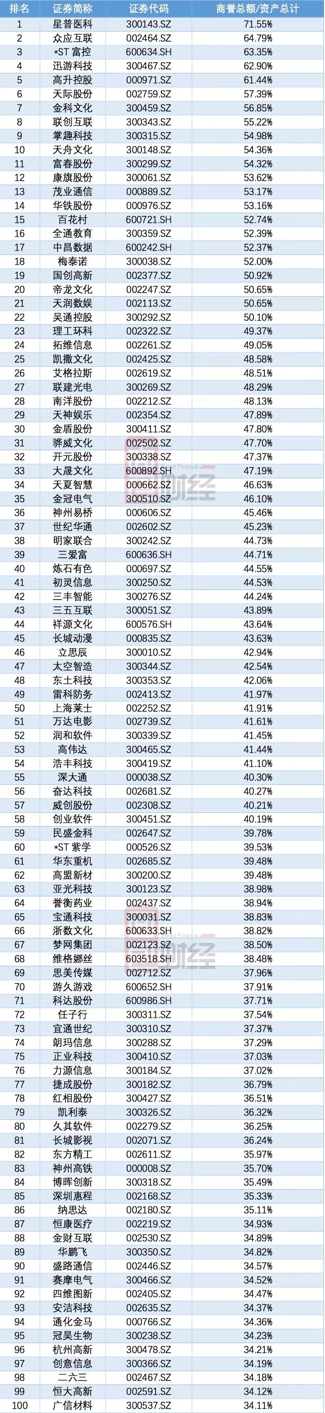 按照商譽占歸屬于母公司股東權益和資產總額占比,排名前100名如下: