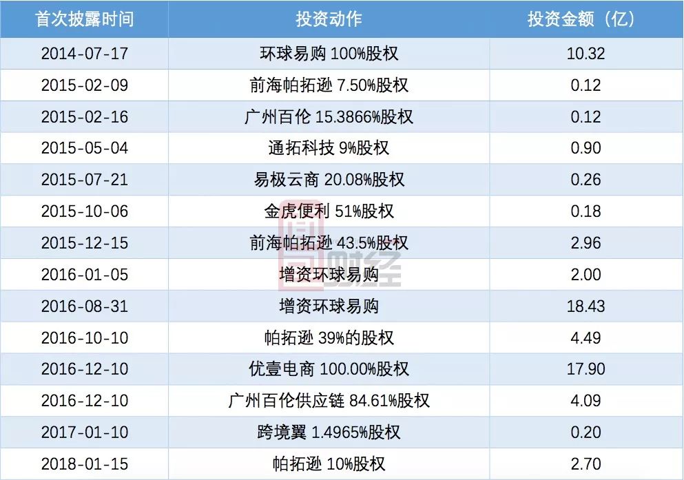 轉型電商之后,跨境通就開啟了“買買買”的連續并購模式,以下為根據公開信息整理的公司并購擴張歷程: