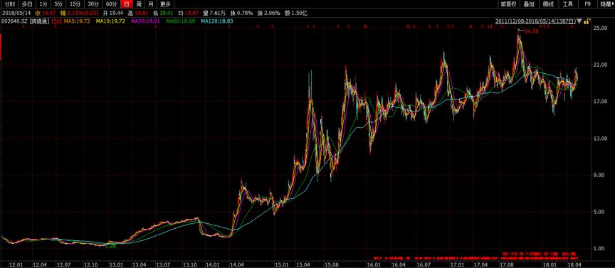 這一系列并購拉動了公司業績的持續上升,自2014至2017年,公司歸母凈利潤由0.33億元增至7.51億元,累計增幅達到2175.76%。而隨著業績增長,公司的股價也是一路上揚。