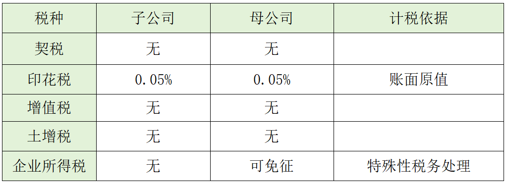 從表可以看出,資產劃轉模式下,子公司只涉及印花稅,免征契稅。