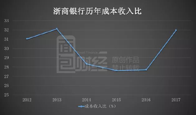 2017年浙商銀行的成本收入比為31.96%,較2016年提升了4.24個(gè)百分點(diǎn),在9家上市股份行的增幅排行中,與興業(yè)銀行并列第一。