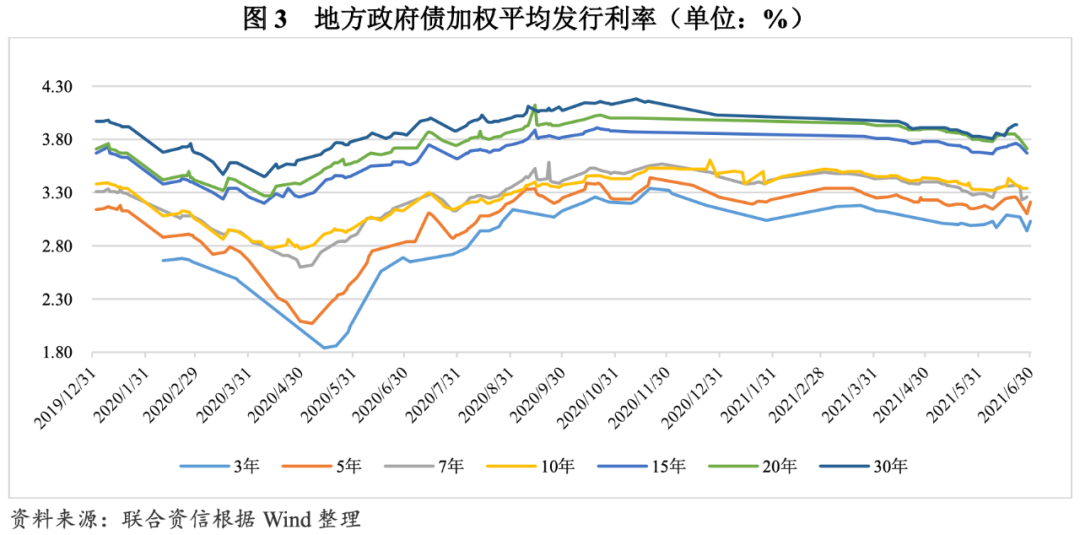 發(fā)行利率整體呈小幅下降走勢,期限利差同比有所收斂。發(fā)行利率方面,2021年上半年,央行繼續(xù)實施穩(wěn)健的貨幣政策,綜合運用多種貨幣政策工具,通過公開市場操作、中期借貸便利(MLF)、定向中期借貸便利(TMLF)、常備借貸便利(SLF)以及央行票據(jù)互換等工具,合理安排工具搭配和操作節(jié)奏,維持市場流動性的合理充裕。在寬松適度的貨幣政策背景下,2021年上半年地方政府債券發(fā)行利率整體呈小幅下降走勢。一季度,地方政府債發(fā)行利率呈先降后升走勢(長期限地方政府債券發(fā)行利率相對穩(wěn)定主要系發(fā)行較少導(dǎo)致樣本少所致),7年和10年期地方政府債的發(fā)行利率較為接近。二季度,各期限地方政府債券的發(fā)行利率波動均較大,6月底,10年及以下期限地方政府債券發(fā)行利率有所回升,15年及20年地方政府債券發(fā)行利率有所回落。