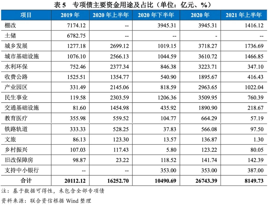 2021年上半年,專項債募集資金主要投向結(jié)構(gòu)較2020年全年變化不大,仍以基建類項目為主。同時,2021年上半年已有387.00億元專項債用于支持中小銀行發(fā)展,發(fā)行規(guī)模已超過2020年全年。2021年上半年,新增專項債發(fā)行速度放緩,其中用于水利環(huán)保、收費公路、民生事業(yè)、教育醫(yī)療、鐵路軌道等方向的專項債發(fā)行規(guī)模不足2020年全年發(fā)行規(guī)模的30%。2021年上半年,用于棚戶區(qū)改造的專項債規(guī)模占到當(dāng)期項目收益類專項債的17.38%,上年同期無棚改專項債發(fā)行。