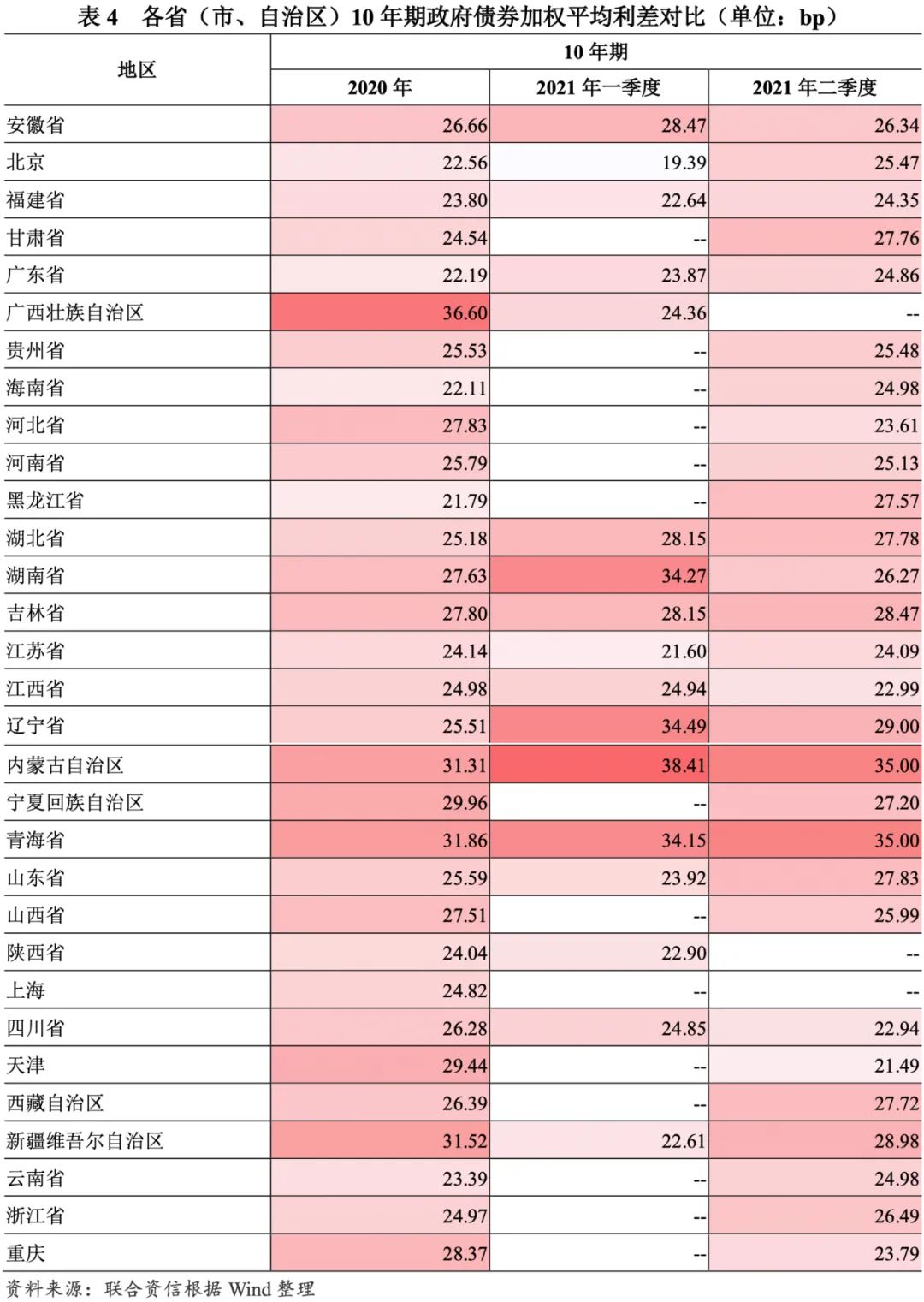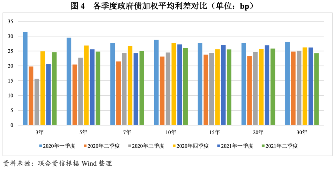 發(fā)行利差走勢有所分化,中長期品種的區(qū)域利差有所擴(kuò)大。發(fā)行利差方面,以同期限中債國債到期收益率為基準(zhǔn),2021年一季度,10年及以下期限政府債券加權(quán)平均利差環(huán)比均有所下降,15年及以上期限政府債券加權(quán)平均利差環(huán)比有所上升或保持相對穩(wěn)定;2021年二季度,除3年和7年政府債券外,其他期限政府債券加權(quán)平均利差環(huán)比均有所下降。分區(qū)域看,2020年以來,青海省和內(nèi)蒙古自治區(qū)發(fā)行的中長期品種利差顯著高于其他區(qū)域;一季度,區(qū)域分化較上年度明顯走闊;二季度,中長期品種的區(qū)域利差有所收斂。與2020年相比,有近一半省(市、自治區(qū))2021年二季度政府債券發(fā)行利差有所下降,其中天津市、重慶市和河北省發(fā)行利差降幅均超過4bp,天津市最高為7.95bp;黑龍江省、內(nèi)蒙古自治區(qū)、遼寧省、甘肅省和青海省發(fā)行利差增幅超過3bp。