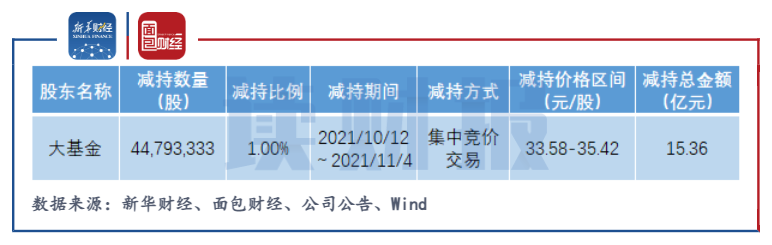 就在公司發(fā)布非公開發(fā)行股票預案后的一個月多內(10月12日至11月4日),大基金通過集中競價交易方式減持公司股份4479.33萬股,占總股本的1%。減持價格區(qū)間在33.58元/股-35.42元/股,套現近15.36億元。大基金此次計劃減持近8959萬股,截至11月4日,大基金減持計劃實施過半,未來仍有可能會減持。