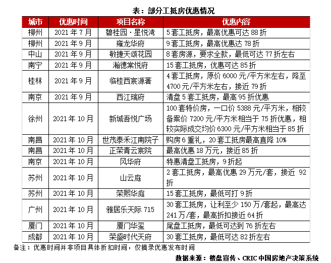 數量而言,一般單盤的工抵房套數多數在10套以下,也有部分樓盤推出20套、30套甚至更多工抵房源,不過這種情況可能為房企變相降價促銷。其優惠力度由市場情況,企業資金缺口、以及供應商、施工方意愿掛鉤。高能級的熱點城市即便有工抵房入市,其價格也相對堅挺,多在9折之上,三四線由于去化壓力更大,折扣力度也相對較大,可以下探突破8折。同樣開發商若資金壓力較大,為了回籠資金可能會擴大讓利幅度。另外一般情況下,工抵房由開發商折價抵押給供應商和施工方,若是供應商和施工方希望盡快回款,可能會在原價格基礎上進一步讓利,擴大折扣。