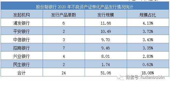 2020年股份制銀行資產承壓,不良資產化解需求較大,因此不良資產證券化發行產品較多。其中以浦發銀行發行產品單數最多,規模最大。而民生銀行發行發行規模最小。整體而言,股份制銀行不良資產證券化產品發行規模處于第二梯隊: