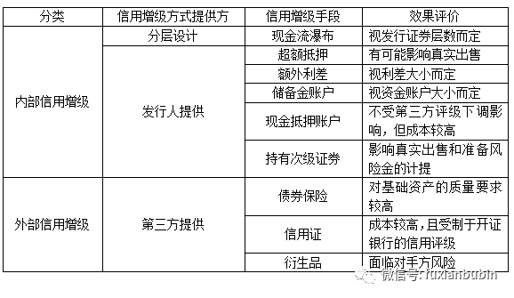 不良資產池的信用評級很低,必須經過信用增級,發行信用評級高的新證券,才能得到市場的認可。信用增級的主要方式分為兩種,分別是內部信用增級和外部信用增級。外部信用增級操作起來比較簡單,最主要依賴于擔保人的信用。而內部信用增級是資產證券化常采用的方法,其主要通過證券化的交易結構設計來完成。