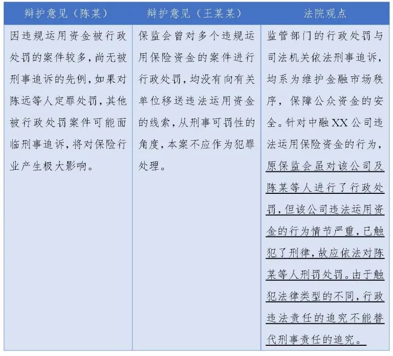 此外,在“胡某某等案”中,辯護人提出了行政違法性能夠成為阻卻刑事犯罪的理由,即如果被告單位已經(jīng)受到到銀保監(jiān)會的行政處罰就不應再受到刑事處罰的觀點,而法院認為不存在經(jīng)過行政處罰就不能受刑事處罰的相關規(guī)定,兩者法律類型不同,行政違法責任的處罰不能替代刑事責任。